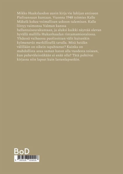 Mikko Haaksluodon uusin kirja vie lukijan entiseen Pielisensuun kuntaan. Vuonna 1948 työmies Kalle Mäkelä kokee voimallisen uskoon tulemisen. Kalle liittyy vaimonsa Valman kanssa helluntaiseurakuntaan, ja aluksi kaikki näyttää olevan hyvällä mallilla Hukanhaudan rintamamiestalossa. Yhdessä vaiheessa puolisoitten välit kuitenkin kylmenevät merkillisellä tavalla. Mitä heidän välillään on oikein tapahtunut? Kuinka on mahdollista asua saman katon alla vuodesta toiseen, kun puheväleissäkään ei enää olla? Tätä pohtivat kirjassa niin lapset kuin lastenlapsetkin.