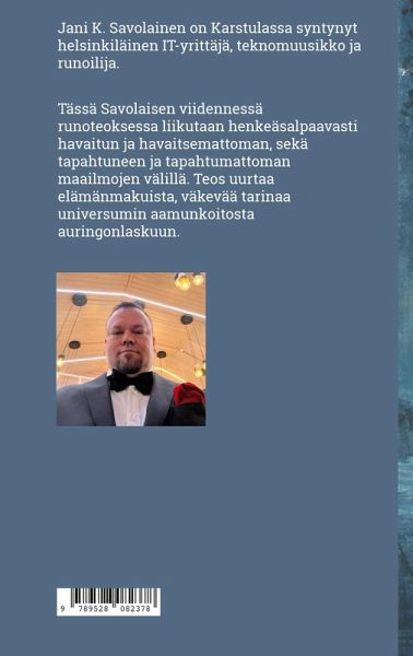Tässä Savolaisen viidennessä runoteoksessa liikutaan henkeäsalpaavasti havaitun ja havaitsemattoman, sekä tapahtuneen ja tapahtumattoman maailmojen välillä. Teos uurtaa elämänmakuista, väkevää tarinaa universumin aamunkoitosta auringonlaskuun.