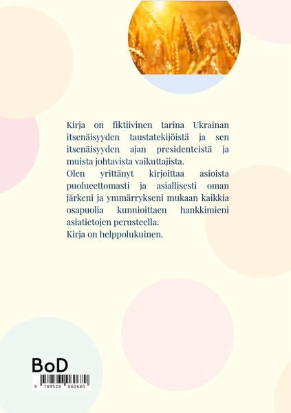 Kirja on fiktiivinen tarina Ukrainan itsenäisyyden taustatekijöistä ja sen itsenäisyyden ajan presidenteistä ja muista johtavista vaikuttajista. Olen yrittänyt kirjoittaa asioista puolueettomasti ja asiallisesti oman järkeni ja ymmärrykseni mukaan kaikkia osapuolia kunnioittaen hankkimieni asiatietojen perusteella. Kirja on helppolukuinen.