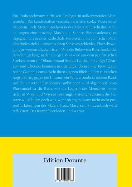Ein Krähenschwarm zieht wie Treibgut in aufkommenden Winternebel. Die Landschaften versinken wie eine stolze Flotte unter bleichem Tuch. Moschusochsen in der Arktis schütteln ihre Mähne, tragen eine brüchige Maske aus Schnee. Sintersäulenwelten begegnen uns in einer Kathedrale aus Gestein. Im polnischen Paradies finden sich Ukrainer in einen Schatten gekleidet, Fluchtbewegungen werden abgeschritten. Wie die Bukowina Rose Ausländer bewohnt, gelangt in den Spiegel. Was wird aus dem pazifistischen Streben, wenn ein Diktator es auf brutale Landnahme anlegt? Charkiw und Cherson kommen in den Blick, ebenso wie Kiew. Zahlreiche Gedichte entwickeln ihren eigenen Blick auf den russischen Angriffskrieg gegen die Ukraine, ein Schwerpunkt in diesem Band. Auf die Unvernunft nuklearer Ambitionen wird abgehoben. Vom Flurwandel ist die Rede, wie die Logistik des Menschen immer tiefer in Wald und Wiesen vordringt. Mitunter scheinen die Gesetze wie Kleider, doch was, wenn sie irgendwann nicht mehrpassen? Erfahrungen des Malers Franz Marc, sein Skizzenbuch wird reflektiert. Das Kaminfeuer lodert und wärmt.