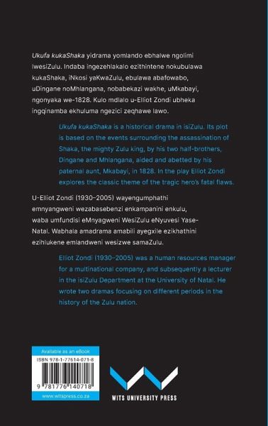 Ukufa kukaShaka is a historical drama by Elliot Zondi, first published in 1960 in the Bantu (later, African) Treasury Series by the University of the Witwatersrand Press. Its plot is based on the events surrounding the assassination of Shaka, the mighty Zulu king, by his two half-brothers, Dingane and Mhlangana, aided and abetted by his paternal aunt, Mkabayi, in 1828. The play explores the classic theme of the tragic hero's fatal flaws: hubris and overconfidence. Shaka's ruthless ambition led him to overstep human boundaries, kill with impunity, bar his warriors from having families and force them into endless wars. His blind spot seems to have been to put the survival and expansion of the Zulu kingdom first and the welfare of his subjects second. Against this backdrop Mkabayi, whose ambitions for a remarkable Zulu nation were more tempered, played a decisive role in his downfall. Zondi explores arguments both in favor of and against Shaka's assassination in a way that allows the reader to sympathize with his greater vision and his thwarted plan to fight impending colonialism. His dramatization of the conflict between Shaka and Mkabayi highlights questions of leadership and nation-building that continue to be relevant today.