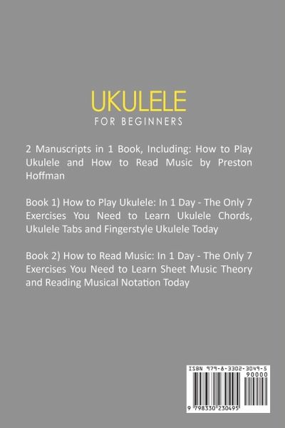 2 Manuscripts in 1 Book, Including: How to Play Ukulele and How to Read Music! Book 1) How to Play Ukulele: In 1 Day - The Only 7 Exercises You Need to Learn Ukulele Chords, Ukulele Tabs and Fingerstyle Ukulele Today You will learn the following: -How to buy a ukulele -The different parts of a ukulele -How to hold your ukulele -The chords of the ukulele -Chord transitioning -Chord progression -How to strum the ukulele -How to read tabs -Learnng fingerstyle -Songs you can play -And much more! Book 2) How to Read Music: In 1 Day - The Only 7 Exercises You Need to Learn Sheet Music Theory and Reading Musical Notation Today You will learn the following: -Fundamentals of music theory -Common practice part writing -Fundamentals of music notation -The evolution of staff notation -Elements of reading sheet music -Types of sheet music -Seven step-by-step exercises to help you learn how to read sheet music -And so much more! Order "Ukulele: For Beginners" Now!