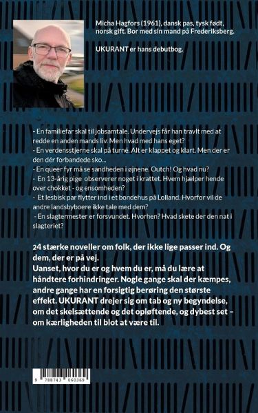 UKURANT - 24 stærke noveller, om homoer og heteroer og andre folk, der ikke lige passer ind (eller er på vej dertil). Nogle kalder dem for LGBT+, andre kalder dem bare folk som du og jeg. Novellerne er hjerteskærende, frække eller skræmmende. Nogle af dem er det hele. Historierne udspiller sig på Valby Bakke, på Christianshavn, på Amager, ved Limfjorden, på Lolland, i Tyskland, Norge, Italien og Australien. Og i Grimstrup. Uanset, hvor du er og hvem du er, må du lære at håndtere forhindringer. Nogle gange skal der kæmpes, andre gange er det en forsigtig berøring, der har den største effekt. UKURANT drejer sig om tab og ny begyndelse, om det skelsættende og det opløftende, og dybest set - om kærligheden til blot at være til.