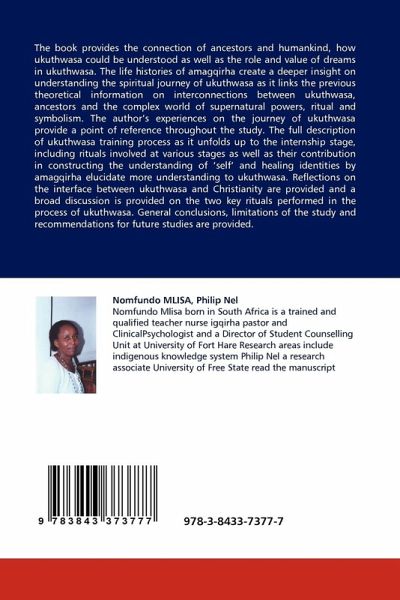 The book provides the connection of ancestors and humankind, how ukuthwasa could be understood as well as the role and value of dreams in ukuthwasa. The life histories of amagqirha create a deeper insight on understanding the spiritual journey of ukuthwasa as it links the previous theoretical information on interconnections between ukuthwasa, ancestors and the complex world of supernatural powers, ritual and symbolism. The author's experiences on the journey of ukuthwasa provide a point of reference throughout the study. The full description of ukuthwasa training process as it unfolds up to the internship stage, including rituals involved at various stages as well as their contribution in constructing the understanding of self' and healing identities by amagqirha elucidate more understanding to ukuthwasa. Reflections on the interface between ukuthwasa and Christianity are provided and a broad discussion is provided on the two key rituals performed in the process of ukuthwasa. General conclusions, limitations of the study and recommendations for future studies are provided.