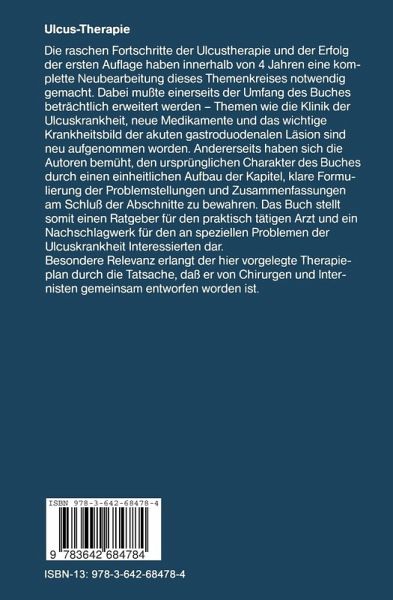 Grundlagen.- 1 Problemstellung.- 2 Epidemiologie und Genetik der Ulcuskrankheit.- 3 Pathogenese des Ulcus ventriculi.- 4 Das pylorische Ulcus.- 5 Pathogenese des Ulcus duodeni.- 6 Pathogenese der akuten gastroduodenalen Läsion ("Streßulcus").- 7 Protektive Mechanismen der Magen- und Duodenal- schleimhaut und ihre Beziehungen zur akuten Läsion.- 8 Pathogenese und klinische Bedeutung der Gastritis.- 9 Konsequenzen.- Klinik der Ulcuskrankheit.- 10 Problemstellung.- 11 Symptomatik des peptischen Ulcus.- 12 Natürlicher Verlauf der Ulcuskrankheit.- 13 Was kostet ein Ulcus?.- 14 Epidemiologie und Klinik der akuten gastroduodenalen.- 15 Konsequenzen.- Prinzipien der konservativen Therapie.- 16 Problemstellung.- 17 Allgemeine Maßnahmen.- 18 Psychotherapie?.- 19 Antacida, Wismutsalze, Filmbildner.- 20 Cimetidin.- 21 Ranitidin.- 22 Pirenzepin.- 23 Trimipramin.- 24 Andere Sekretionshemmer und Medikamente zur Förderung der Schleimhautresistenz.- 25 Interaktionen von Ulcustherapeutica.- 26 Konsequenzen.- Prinzipien operativer Therapie.- 27 Problemstellung.- 28 Therapeutisches Prinzip: Vagotomie.- 29 Therapeutisches Prinzip: Pyloroplastik und Pylorusdilatation.- 30 Therapeutisches Prinzip: Resektion.- 31 Andere chirurgische Eingriffe: Gastroenterostomie, Ulcusexcision und limitierte Resektion.- 32 Konsequenzen.- Notwendige Diagnostik.- 33 Problemstellung.- 34 Notwendige Diagnostik des peptischen Ulcus: Endoskopie.- 35 Notwendige Diagnostik des peptischen Ulcus: Radiologie.- 36 Notwendige Diagnostik des peptischen Ulcus: Funktionstests.- 37 Konsequenzen.- Praktische Therapie des unkomplizierten Ulcus.- 38 Problemstellung.- 39 Therapieziele beim peptischen Ulcus.- 40 Indikation und Plan der konservativen Therapie des unkomplizierten Ulcus duodeni und des Ulcus ventriculi.- 41Therapiekontrollen beim Ulcus ventriculi und duodeni.- 42 Indikation zur chirurgischen Therapie beim unkomplizierten Ulcus ventriculi.- 43 Die Indikation zur operativen Therapie des unkomplizierten Ulcus duodeni.- 44 Konsequenzen.- Praktische Therapie der Ulcuskomplikationen.- 45 Problemstellung.- 46 Ulcusperforation.- 47 Ulcusblutung.- 48 Benigne Magenausgangsstenose.- 49 Praktische Konsequenzen.- Praktische Therapie des postoperativen Rezidivulcus.- 50 Problemstellung.- 51 Erfolgskontrollen nach chirurgischer Therapie.- 52 Die internistische Behandlung von Rezidivulcera nach Magenteilresektion und nach Vagotomie.- 53 Indikationen beim postoperativen Rezidivulcus nach Vagototomie.- 54 Indikationen beim postoperativen Rezidivulcus nach Resektion.- 55 Konsequenzen.- Prophylaxe und Therapie gastroduodenaler Läsionen.- 56 Problemstellung.- 57 Prophylaxe der akuten gastroduodenalen Läsionen.- 58 Medikamentöse Therapie der akuten gastroduodenalen Läsion.- 59 Indikation und chirurgische Verfahrenswahl bei den akuten gastroduodenalen Läsionen.- 60 Konsequenzen.
