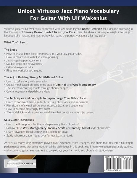 Discover Oscar Peterson’s Piano Licks for Jazz guitar Unlock virtuoso jazz piano vocabulary for guitar Virtuoso guitarist Ulf Wakenius performed with jazz piano legend Oscar Peterson for a decade, and followed in the footsteps of Barney Kessel, Herb Ellis and Joe Pass. In Oscar Peterson Licks for Jazz Guitar, Ulf shares his unique insight into the jazz concepts of Oscar Peterson, and teaches how that language creates the perfect vocabulary for jazz guitar. What You’ll Learn Oscar Peterson was the complete musician and matched effortless technique and dexterity with perfect time, a huge melodic vocabulary, a deep level of harmony, and a unique energetic creativity that powered his music. In this book, Ulf teaches you how to combine these essential musical elements to create the language of a jazz piano icon, while teaching you to master dozens of jazz guitar licks that give you the perfect jazz guitar vocabulary. Among other things, you’ll study… The Blues How to weave blues ideas seamlessly into your jazz guitar solos How to create lines with fluid vocal-phrasing Jaw-dropping pentatonic runs Outstanding double-stops and octave lines Call and response licks Masterful rhythmic variation techniques The art of building strong motif-based solos Learn to tell a story with your solo Create motif-based phrases in the style of Jim Hall and Wes Montgomery The secret to carrying motifs through chord changes Catchy ostinato and pedal-tone ideas The techniques and concepts to 10x your bebop licks Learn to construct bebop guitar licks using chromatics and enclosures Play dozens of swinging licks over essential jazz chord sequences How to execute blisteringly fast runs! The modal licks and sequence-based lines that create a modern jazz sound Discover The Secret to Perfect Solo Jazz Guitar Arranging Soloing with block chords was another important feature of Oscar’s playing. Here you’ll learn the secret principles behind this technique. By learning several longer study pieces, you’ll gain valuable insight into creating your own originalblock chord solos. Learn the three principles that underpin everyblock chord solo Discover lush Wes Montgomery, Johnny Smithand Barney Kesselstyle chord solos Learn advanced chord voicing and substitution ideas Study reharmonization ideas over famous jazz standards Full-Length Jazz Guitar Pieces Bring Everything Together As well as many long examples played over extended chord changes, the finale features three full-length performance solos that bring together all the techniques in the book. You’ll learn two bebop blues solo studies, and a stunning guitar arrangement to consolidate your harmonic and chord substitution ideas. Hear it! Ulf Wakenius’ Oscar Peterson Licks for Jazz Guitar contains over 1-hour of audio that’s free to download from our dedicated website. You’ll hear Ulf’s original recordings so you can play the music right – every time. Buy it now and bring the iconic language of a jazz piano virtuoso home to your guitar
