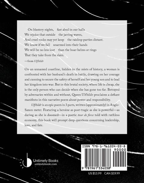 On blustery nights, fast abed in our halls We rejoice that outside, the jarring waves, And cruel rocks may yet keep the raiding-parties distant. We know if we fall unarmed into their hands We will be no less loot than the boar-helms or rings That they take from the slain. -from Ulfhildr On an unnamed coastline, hidden in the mists of history, a woman is confronted with her husband's death in battle, drawing on her courage and cunning to secure the safety of herself and her young son and to lead her kingdom into war. But in this brutal society, where life is cheap, she is the only person who can decide when she has gone too far. Betrayed by adversaries within and without, Queen Ulfhildr proclaims a defiant manifesto in this narrative poem about power and responsibility. Ulfhildr is an epic poem in 3 parts, written (approximately) in Anglo-Saxon meter. Featuring a heroine as post-tragic as she is powerful-as daring as she is doomed-in a poetic tour de force told with ruthless economy, this book will prompt deep questions concerning leadership, love, and fate.