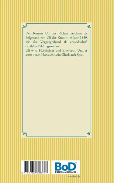 Der Roman Uli der Pächter erschien als Folgeband von Uli der Knecht im Jahr 1849, wie der Vorgängerband als episodenhaft erzählter Bildungsroman. Uli wird Hofpächter und Ehemann. Und er setzt durch Habsucht sein Glück aufs Spiel.