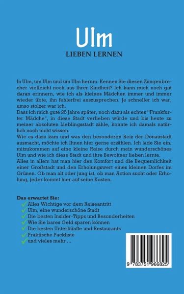 In Ulm, um Ulm und um Ulm herum. Kennen Sie diesen Zungenbrecher vielleicht noch aus Ihrer Kindheit? Ich kann mich noch gut daran erinnern, wie ich als kleines Mädchen immer und immer wieder übte, ihn fehlerfrei auszusprechen. Je schneller ich war, umso stolzer war ich.Dass ich mich gute 25 Jahre später, noch dazu als echtes ,,Frankfurter Mädche'', in diese Stadt verlieben würde und bis heute zu meiner absoluten Lieblingsstadt zähle, konnte ich damals natürlich noch nicht wissen.Wie es dazu kam und was den besonderen Reiz der Donaustadt ausmacht, möchte ich Ihnen hier gerne erzählen. Ich lade Sie ein, mitzukommen auf eine kleine Reise durch mein wunderschönes Ulm und wie ich diese Stadt und ihre Bewohner lieben lernte.Alles in allem hat man hier den Komfort und die Bequemlichkeit einer Großstadt und den Erholungswert eines kleinen Dorfes im Grünen. Ob man alt oder jung ist, ob man Action sucht oder Erholung, jeder kommt hier auf seine Kosten.Das erwartet Sie:-Alles Wichtige vor dem Reiseantritt-Ulm, eine wunderschöne Stadt-Die besten Insider-Tipps und Besonderheiten-Wie Sie bares Geld sparen können-Die besten Unterkünfte und Restaurants-Praktische Packliste-und vieles mehr ...
