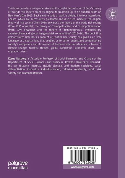 This book provides a comprehensive and thorough interpretation of Beck's theory of the (world) risk society, from its original formulation up to his sudden death on New Year's Day 2015. Beck's entire body of work is divided into four interrelated phases, which are successively presented and discussed, namely: the original theory of risk society (from 1986 onwards); the theory of the world risk society (from 1996 onwards); the theory of cosmopolitanism and cosmopolitanization (from 1996 onwards); and the theory of 'metamorphosis', 'emancipatory catastrophism and 'global imagined risk communities' (2013-16). The book thus demonstrates how Beck's concept of the (world) risk society has given us a new language or a special lens that enables us to better understand contemporary society's complexity and its myriad of human-made uncertainties in terms of climate change, terrorist threats, global pandemics, economic crises, and migration crises.