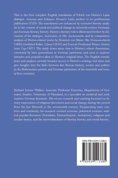 This is the first complete English translation of Ulrich von Hutten's Latin dialogue Arminius and Eobanus Hessus's Latin preface to its posthumous publication (1529). The translations are enhanced by extensive literary analysis in the context of social and political change in sixteenth-century Germany and German literary history. Hutten's literary role is illustrated further by discussion of his dialogue, Inspicientes , or Die Anschauenden , and by comparative analysis of Hutten-related works by Heinrich von Kleist, Die Hermannschlacht (1808), Gottfried Keller, Ufenau (1858), and Conrad Ferdinand Meyer, Huttens letzte Tage (1871). The study draws attention to Hutten's ethnic chauvinism, construed by later generations as German patriotism and used to endorse attitudes and prejudices alien to Hutten's original ideas. The English translations and analyses provide broader access to Hutten's writings and ideas and give insights into the links between late Roman history, society and politics in the Reformation period, and German patriotism of the twentieth and twenty-first centuries.