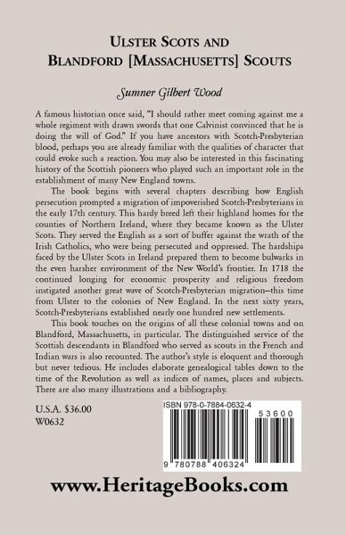 A famous historian once said, "I should rather meet coming against me a whole regiment with drawn swords that one Calvinist convinced that he is doing the will of God." If you have ancestors with Scotch-Presbyterian blood, perhaps you are already familiar with the qualities of character that could evoke such a reaction. You may also be interested in this fascinating history of the Scottish pioneers who played such an important role in the establishment of many New England towns. The book begins with several chapters describing how English persecution prompted a migration of impoverished Scotch-Presbyterians in the early 17th century. This hardy breed left their highland homes for the counties of Northern Ireland, where they became known as the Ulster Scots. They served the English as a sort of buffer against the wrath of the Irish Catholics, who were being persecuted and oppressed. The hardships faced by the Ulster Scots in Ireland prepared them to become bulwarks in the even harsher environment of the New World's frontier. In 1718 the continued longing for economic prosperity and religious freedom instigated another great wave of Scotch-Presbyterian migration--this time from Ulster to the colonies of New England. In the next sixty years, Scotch-Presbyterians established nearly one hundred new settlements. This book touches on the origins of all these colonial towns and on Blandford, Massachusetts, in particular. The distinguished service of the Scottish descendants in Blandford who served as scouts in the French and Indian wars is also recounted. The author's style is eloquent and thorough but never tedious. He includes elaborate genealogical tables down to the time of the Revolution as well as indices of names, places and subjects. There are also many illustrations and a bibliography.
