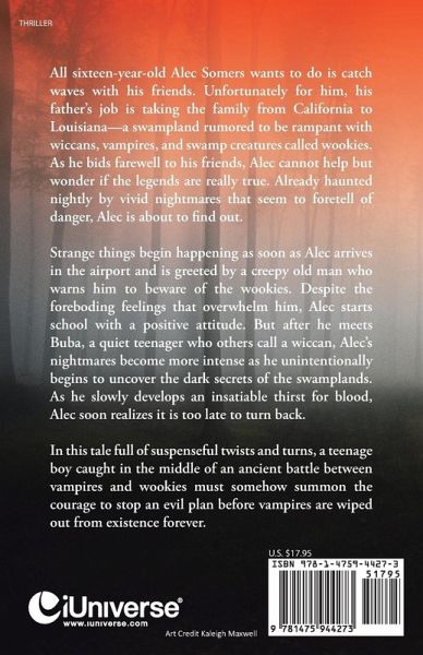 All sixteen-year-old Alec Somers wants to do is catch waves with his friends. Unfortunately for him, his father’s job is taking the family from California to Louisiana—a swampland rumored to be rampant with wiccans, vampires, and swamp creatures called wookies. As he bids farewell to his friends, Alec cannot help but wonder if the legends are really true. Already haunted nightly by vivid nightmares that seem to foretell of danger, Alec is about to find out. Strange things begin happening as soon as Alec arrives in the airport and is greeted by a creepy old man who warns him to beware of the wookies. Despite the foreboding feelings that overwhelm him, Alec starts school with a positive attitude. But after he meets Buba, a quiet teenager who others call a wiccan, Alec’s nightmares become more intense as he unintentionally begins to uncover the dark secrets of the swamplands. As he slowly develops an insatiable thirst for blood, Alec soon realizes it is too late to turn back. In this tale full of suspenseful twists and turns, a teenage boy caught in the middle of an ancient battle between vampires and wookies must somehow summon the courage to stop an evil plan before vampires are wiped out from existence forever.