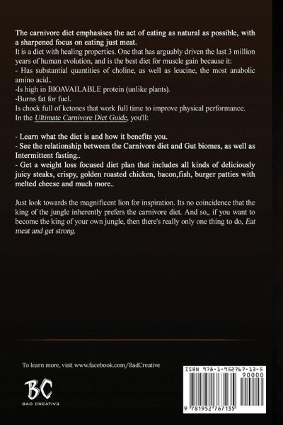 The carnivore diet emphasizes the act of eating as naturally as possible, with a sharpened focus on eating just meat. It is a diet with healing properties. One that has arguably driven the last three million years of human evolution. It is the best diet for muscle gain because:It has substantial quantities of choline, as well as leucine, the most anabolic amino acid. It is high in bioavailable protein (unlike plants). It urns fat for fuel. It is chock-full of ketones that work full-time to improve physical performance. In the Ultimate Carnivore Diet, you'll:Learn what the diet is and how it benefits you Find the relationship between the carnivore diet and gut biomes, as well as intermittent fasting. Get a diet plan focused on weight loss that includes all kinds of deliciously juicy steaks, crispy, golden roasted chicken, bacon, fish, burger patties with melted cheese, etc And much more...