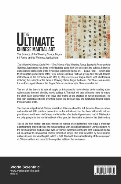 The Ultimate Chinese Martial Art — The Science of the Weaving Stance Bagua 64 Forms and the Wellness Applications has three well integrated parts. Part One describes the cultural, historical and scientific background of the mysterious inner style martial art — Bagua Palm — which used to be taught in a small circle of the Royal families in China. Part Two gives a brief and yet detailed instructions on the techniques and step by step exercises of Bagua Palms with illustrations, including the example of the famous Weaving Stance Bagua 64 Forms. Part Three summarizes the wellness applications of the Bagua Palms as an inner style Chinese martial art. The aim of this book is to help all people on this planet to have a better understanding about wellness and the most effective way to achieve it. The book will thus ultimately make its way to the short list of books which truly leave their marks on the progress of human civilization. The less than sophisticated style of writing makes this book an easy and helpful reading for people from all walks of life. This book is not just about Chinese martial art. It is also about the link between Chinese culture and martial art. With practical instructions on the actual exercise, this book will benefit not just practitioners and trainers in Chinese martial art but effectively all people who read it. This book is not only going to be the martial art book of the year, but the martial art book of the 21st century. This is the first martial art book written by martial art practitioners who have thorough understanding of both physics and actual fighting, with a solid background in Chinese culture. All the three authors of the book have over 40 years of extensive experience each in Chinese martial art. In contrast to conventional Chinese martial art scripts, this book is written by three Chinese authors in plain and vivid English, which is both filled with true understanding of the unique part of Chinese culture and tuned to the cognitive habits of the westerners.