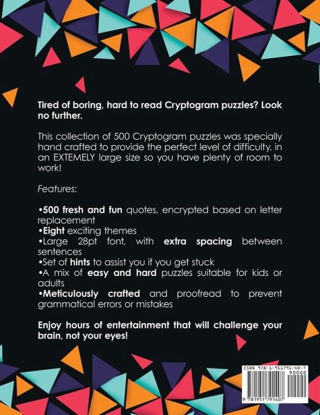 Tired of boring, hard to read Cryptogram puzzles? Look no further. This collection of 500 Cryptogram puzzles was specially hand crafted to provide the perfect level of difficulty, in an EXTEMELY large size so you have plenty of room to work! Features: 500 fresh and fun quotes, encrypted based on letter replacement Eight exciting themes: American History Famous Quotes Quotes by Musicians Science & Technology Sports Quotes Quotes by Presidents Motivational Quotes Funny Quotes Large 28pt font, with extra spacing between sentences Set of hints to assist you if you get stuck A mix of easy and hard puzzles suitable for kids or adults Meticulously crafted and proofread to prevent grammatical errors or mistakes Enjoy hours of entertainment that will challenge your brain, not your eyes!