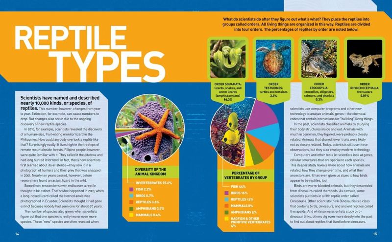 The natural world experts at National Geographic present the ultimate reference book on reptiles, designed just for kids. Crawling with fascinating facts, lively text, and tons of cool, colorful, images of the weirdest and wackiest reptiles on planet Earth, it is sure to be their coveted, #1 reference. Snakey, slimey, scaley, and sensational! Welcome to the amazing world of the most popular reptiles on Earth. With colorful photographs and fun facts, this easy-to-use encyclopedia profiles snakes, lizards, amphibians, turtles and tortoises, crocodilians, and tuatara. Profiles are accompanied by Did You Know? details and fast facts including scientific name, size, diet, and habitat.