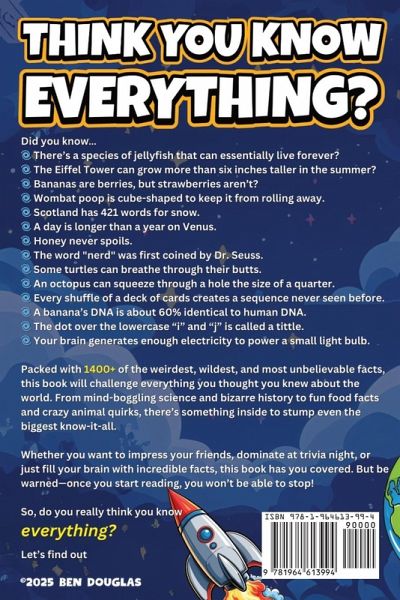 You think you know Everything?Did you know... ¿¿¿¿ There's a species of jellyfish that can essentially live forever? ¿¿¿¿ The Eiffel Tower can grow more than six inches taller in the summer? ¿¿¿¿ Wombat poop is cube-shaped to keep it from rolling away. ¿¿¿¿ Some turtles can breathe through their butts. Packed with 1400+ of the weirdest, wildest, and most unbelievable facts, this book will challenge everything you thought you knew about the world. From mind-boggling science and bizarre history to fun food facts and crazy animal quirks, there's something inside to stump even the biggest know-it-all. Whether you want to impress your friends, dominate at trivia night, or just fill your brain with incredible facts, this book has you covered. But be warned-once you start reading, you won't be able to stop! ¿¿¿¿ Every shuffle of a deck of cards creates a sequence never seen before. ¿¿¿¿ A banana's DNA is about 60% identical to human DNA. ¿¿¿¿ The dot over the lowercase "i" and "j" is called a tittle. ¿¿¿¿ Your brain generates enough electricity to power a small light bulb. So, do you really think you know everything? Let's find out
