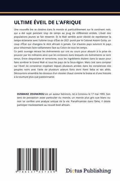 Une nouvelle ère se dessine dans le monde et particulièrement sur le continent noir, qui a été sujet pendant trop de temps au joug de différentes entités. L'éveil des populations jeunes se fait ressentir. Et le Mali semble avoir décidé de représenter la lampe éclairante avec l'ultime coup d'État de 2021 porté par le Colonel Assimi Goïta, un coup d'État qui changera le récit africain à jamais. Car d'autres pays suivront le pays pour désormais faire vaillamment face au Colon de tous les temps.Ce petit ouvrage retrace les événements qui ont eu cours pour aboutir à la prise de pouvoir par les militaires ainsi que les contextes dans lesquels ces événements se sont tenus. Entre despotisme et terrorisme, tous les ingrédients étaient dans la sauce pour faire sombrer le Grand Mali et tous les pays de la Sous-région. Mais c'est sans compter sur l'éveil de conscience s'opérant depuis plusieurs années dans les consciences des peuples noirs avec l'aide de plusieurs acteurs forts dont Kemi Seba et ses alliés. Découvrons ensemble les dessous d'un dossier chaud comme la braise et d'une histoire à la tournure plus que passionnante.