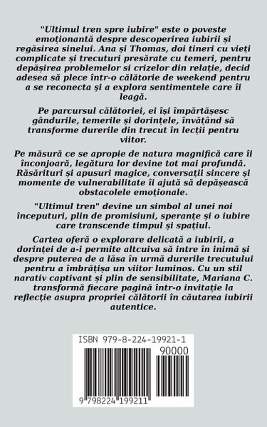 "Ultimul tren spre iubire" este o poveste emo¿ionant¿ despre descoperirea iubirii ¿i reg¿sirea sinelui. Ana ¿i Thomas, doi tineri cu vie¿i complicate ¿i trecuturi pres¿rate cu temeri, pentru dep¿¿irea problemelor si crizelor din reläie, decid adesea s¿ plece într-o c¿l¿torie de weekend pentru a se reconecta ¿i a explora sentimentele care îi leag¿. Pe parcursul c¿l¿toriei, ei î¿i împ¿rt¿¿esc gândurile, temerile ¿i dorin¿ele, înv¿¿ând s¿ transforme durerile din trecut în lec¿ii pentru viitor. Pe m¿sur¿ ce se apropie de natura magnific¿ care îi înconjoar¿, leg¿tura lor devine tot mai profund¿. R¿s¿rituri ¿i apusuri magice, conversäii sincere ¿i momente de vulnerabilitate îi ajut¿ s¿ dep¿¿easc¿ obstacolele emo¿ionale. "Ultimul tren" devine un simbol al unei noi începuturi, plin de promisiuni, speran¿e ¿i o iubire care transcende timpul ¿i späiul. Cartea ofer¿ o explorare delicat¿ a iubirii, a dorin¿ei de a-i permite altcuiva s¿ intre în inim¿ ¿i despre puterea de a l¿sa în urm¿ durerile trecutului pentru a îmbr¿¿i¿a un viitor luminos. Cu un stil narativ captivant ¿i plin de sensibilitate, Mariana C. transform¿ fiecare pagin¿ într-o invitäie la reflec¿ie asupra propriei c¿l¿torii în c¿utarea iubirii autentice.