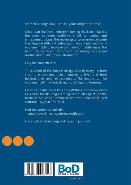 Ultra Lean Business, Entrepreneurship Black Belt tackles the most common problems small companies and entrepreneurs face. The reader gets 50 or more concrete learnings on different subjects, all simply put and easily implementable to increase company competitiveness. The book includes tasks that further the learning process, and useful links for additional information.