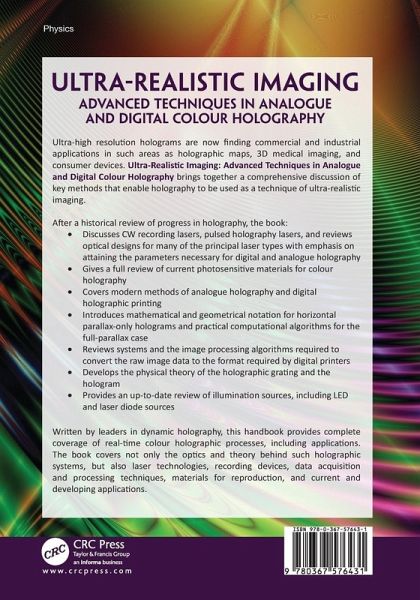 Ultra-Realistic Imaging and Its Historical Origin in Display Holography. Lippmann Photography. Continuous Wave Lasers for Colour Holography. Recording Materials for Colour Holography. Analogue Colour Holography. Pulsed Lasers for Holography. Digital Colour Holography. Digital Holographic Printing: Data Preparation, Theory and Algorithms. Digital Holographic Printing: Computational Methods for Full-Parallax Holograms. Image Data Creation and Acquisition for Digital Display Holograms. Theoretical Basis for High-Fidelity Display Holograms. Diffraction Efficiency: An Alternative Approach Using the PSM Model. Illumination of Colour Holograms. Applications of Ultra-Realistic Holographic Imaging. Acronyms. Appendices: Historical Origins of Display Holography: Spreading Awareness. History of the Geola Organisation. Active Cavity Length Stabilisation in Pulsed Neodymium Lasers. Aberration Correction by Image Predistortion in Digital Hologram. MAXScript Holocam Program. Design Study of Compact RGB LED Hologram Illumination Source. Bilinear and Bicubic Interpolation.