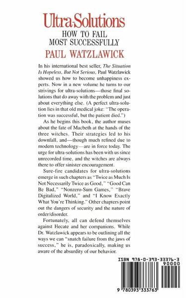 As he begins this book, the author muses about the fate of Macbeth at the hands of the three witches. Their strategies led to his downfall, and--though much refined due to modern technology--are in force today. The urge for ultra-solutions has been with us since unrecorded time, and the witches are always there to offer sinister encouragement. Sure-fire candidates for ultra-solutions emerge in such chapters as "Twice as Much Is Not Necessarily Twice as Good," "Good Can Be Bad," "Nonzero-Sum Games," "Brave Digitalized World," and "I Know Exactly What You're Thinking." Other chapters point out the dangers of security and the nature of order/disorder. Fortunately, all can defend themselves against Hecate and her companions. While Dr. Watzlawick appears to be outlining all the ways we can "snatch failure from the jaws of success," he is, paradoxically, making us aware of the absurdity of our behavior.