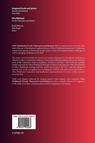 Recent advances in wireless communication technologies have had a transfor- tive impact on society and have directly contributed to several economic and social aspects of daily life. Increasingly, the untethered exchange of information between devices is becoming a prime requirement for further progress, which is placing an ever greater demand on wireless bandwidth. The ultra wideband (UWB) system marks a major milestone in this progress. Since 2002, when the FCC allowed the unlicensed use of low-power, UWB radio signals in the 3. 1-10. 6GHz frequency band, there has been signi?cant synergistic advance in this technology at the c- cuits, architectural and communication systems levels. This technology allows for devices to communicate wirelessly, while coexisting with other users by ensuring that its power density is suf?ciently low so that it is perceived as noise to other users. UWB is expected to address existing needs for high data rate short-range c- munication applications between devices, such as computers and peripherals or consumer electronic devices. In the long term, it makes available spectrum to - periment with new signaling formats such as those based on very short pulses of radio-frequency (RF) energy. As such it represents an opportunity to design fun- mentally different wireless systems which rely on the bandwidth of the signals to enhance the data rate or which use the available bandwidth for diverse applications such as ranging and biomedical instrumentation.
