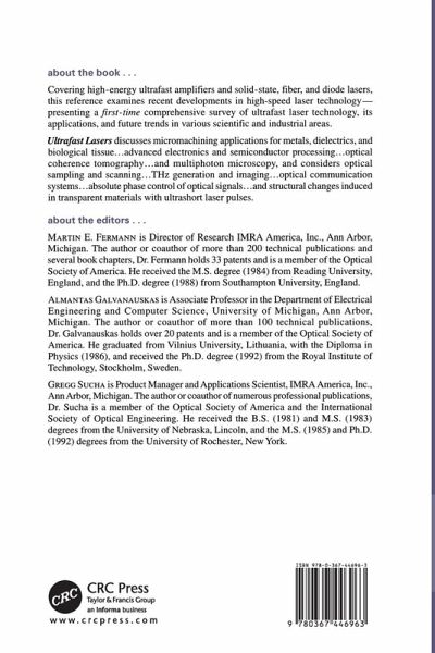 Part I: Laser Systems 1. Ultrafast Solid-State Lasers 2. Ultrafast Solid-State Amplifiers 3. Ultrafast Fiber Oscillators 4. Ultrashort-Pulse Fiber Amplifiers 5. Ultrafast Single- and Multiwavelength Modelocked Semiconductor Lasers: Physics and Applications Part II: Applications 6. Overview of Industrial and Medical Applications of Ultrafast Lasers 7. Micromachining 8. Structural Changes Induced in Transparent Materials with Ultrashort Laser Pulses 9. Rapid Scanning Time Delays for Ultrafast Measurement Systems 10. Electro-Optic Sampling and Field Mapping 11. Terahertz Wave Imaging and Its Applications 12. Phase-Controlled Few-Cycle Light 13. Ultrahigh Bit Rate Communication Systems 14. Nonlinear Microscopy with Ultrashort Pulse Lasers 15. Optical Coherence Tomography 16. Ultrafast Lasers in Ophthalmology