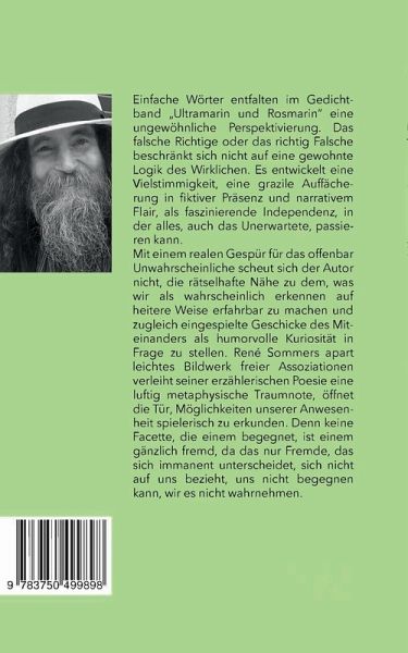 Einfache Wörter entfalten im Gedichtband "Ultramarin und Rosmarin" eine ungewöhnliche Perspektivierung. Das falsche Richtige oder das richtig Falsche beschränkt sich nicht auf eine gewohnte Logik des Wirklichen. Es entwickelt eine Vielstimmigkeit, eine grazile Auffächerung in fiktiver Präsenz und narrativem Flair, als faszinierende Independenz, in der alles, auch das Unerwartete, passieren kann. Mit einem realen Gespür für das offenbar Unwahrscheinliche scheut sich der Autor nicht, die rätselhafte Nähe zu dem, was wir als wahrscheinlich erkennen auf heitere Weise erfahrbar zu machen und zugleich eingespielte Geschicke des Miteinanders als humorvolle Kuriosität in Frage zu stellen. René Sommers apart leichtes Bildwerk freier Assoziationen verleiht seiner erzählerischen Poesie eine luftig metaphysische Traumnote, öffnet die Tür, Möglichkeiten unserer Anwesenheit spielerisch zu erkunden. Denn keine Facette, die einem begegnet, ist einem gänzlich fremd, da das nur Fremde, das sich immanent unterscheidet, sich nicht auf uns bezieht, uns nicht begegnen kann, wir es nicht wahrnehmen.