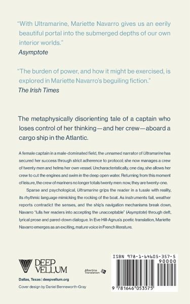 Mariette Navarro is an educator, novelist, and dramaturg. She has been part of the Comédie de Béthune since 2014. She was also associated with the Scènes du Jura for the 2015-2016 season and the théâtre de l'Aquarium for the 2017-2018 season. Since 2016, she has co-directed the Grands fonds collection with Cheyne éditeur. Her plays include Nous les vagues followed by Célébrations (Quartett, 2011), Prodiges(R) (Quartett, 2012), Les Feux de poitrine (Quartett, 2015), Les Chemins contraires (Cheyne éditeur, 2016), Zone à étendre (Quartett, 2018), Les Hérétiques (Quartett, 2018), and Les Désordres imaginaires (Quartett, 2020). Her novella Alors Carcasse (Cheyne éditeur, 2011) won the Robert-Walser Prize 2012. Ultramarine is her first novel. Eve Hill-Agnus is a Franco-American writer, editor, and translator. This is her first novel-length translation.