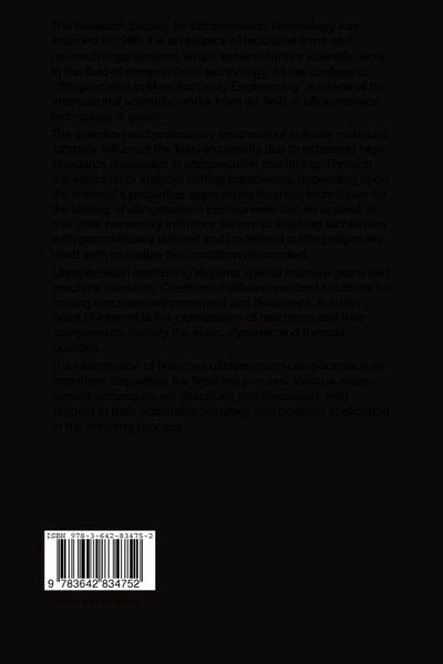 Session I - "Manufacturing Technology".- Experiences in the Precision Machining of Brittle Materials.- Ductile-Regime Grinding of Brittle Materials.- Review on Ultraprecision Grinding Technology.- Precision Machining of Advanced Ceramics - A Challenge in Production Technology.- Precision Grinding of Brittle Materials.- Form Accuracy and Surface Integrity in Plane Lapping.- Cutting Forces and Their Influences upon the Surface Integrity in Single-Point Diamond Turning.- Recent Trends in Diamond Tool Technology.- Prediction of Tolerances in Precision Cutting for Mass Production.- Session II - "Machine Development and Improvement".- Limits of Workpieces Accuracy Caused by the Geometrical and Dynamical Behaviour of Ultraprecision Diamond Turning Machines.- New Material Application to Ultraprecision Lathe.- Machining of Aspherical Surfaces.- A Diamond Turning Apparatus for Fabrication on Non-Rotationally Symmetric Surfaces.- The Design and Construction of a Sub-Microinch Resolution Lathe.- M400 and P400 - a Pair of Machines for Computer-Controlled Fine Correction of Optical Surfaces.- New Design Features of a Fully Hydrostatic Ultra Precision CNC-Turning Machine, Type Super-Mikroturn CNC.- A Personal Prospective on the Quest for Higher Precision Diamond Turning Lathes.- Session 3 - "Measurement Techniques and Equipments".- Nanotechnology at the National Physical Laboratory.- Micro-Indentation Assessment of Near Surface Materials Properties and Sub-Surface Damage in Precision Machining.- Measurement of Ultraprecision Components Using Non-Contact Interferometry Based Instrumentation.- In-Process Surface Finish Measurement of High Quality Components.- Measurement of Steep Aspheric Surfaces Using a Radial Shear Interferometer.- Testing of Aspheric Surfaceswith Computer Generated Holograms.- Synthetic Holograms for the Testing of Aspheric Surfaces.- Experimental Measurement of Optimum Depth of Cut.