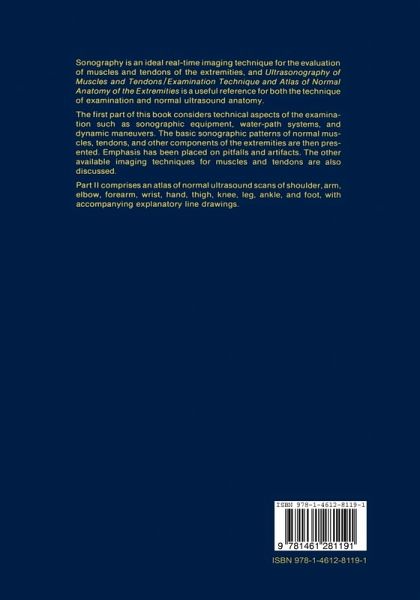 I. Technique of Sonographic Examination and General Considerations on Ultrasound Normal Anatomy.- 1 Anatomic Considerations.- 2 Technique for Sonography of Muscles and Tendons of the Extremities.- 3 Normal Ultrasound Anatomy of Muscles.- 4 Normal Ultrasound Anatomy of Tendons.- 5 Artifacts and Pitfalls in Sonography of Muscles and Tendons.- 6 Sonographic Patterns of the Other Anatomic Components of the Extremities.- 7 Other Imaging Techniques for Muscles and Tendons.- II. Atlas of Ultrasound Scans of the Extremities.- List of Abbreviations.- A Upper Extremity.- Shoulder.- Arm, Upper Third.- Arm, Midthird.- Arm, Lower Third.- Elbow.- Forearm, Upper Third.- Forearm, Midthird.- Forearm, Lower Third.- Wrist.- Hand.- B Lower Extremity.- Thigh, Upper Third.- Thigh, Midthird.- Thigh, Lower Third.- Knee, Patellar Tendon.- Knee, Popliteal Fossa.- Knee, Other Scans.- Leg, Upper Third.- Leg, Midthird.- Leg, Lower Third.- Leg, Achilles Tendon.- Foot.