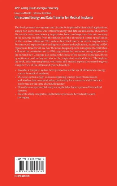 This book presents new systems and circuits for implantable biomedical applications, using a non-conventional way to transmit energy and data via ultrasound. The authors discuses the main constrains (e.g. implant size, battery recharge time, data rate, accuracy of the acoustic models) from the definition of the ultrasound system specification to the in-vitro validation.The system described meets the safety requirements for ultrasound exposure limits in diagnostic ultrasound applications, according to FDA regulations. Readers will see how the novel design of power management architecture will meet the constraints set by FDA regulations for maximum energy exposure in the human body. Coverage also includes the choice of the acoustic transducer, driven by optimum positioning and size of the implanted medical device. Throughout the book, links between physics, electronics and medical aspects are covered to give a complete view of the ultrasound system described.