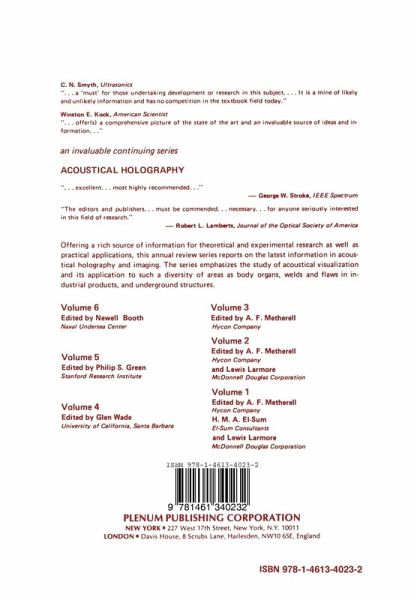 This is the fourth volume of Ultrasound in Medicine, the Proceedings of the Annual Scientific Meeting of the American Institute of Ultrasound in Medicine. Unless the Executive Board of the Institute change their mind, it may also be the last. Under these circumstances it is somewhat ironical that some of the deficiencies present in previous volumes appear to have been solved in the present volume. Notably, the Programme Committee, for the first time, exercised a stringent selection procedure by means of which the number of papers selected for presentation was limited with the result that both the quality of papers accepted for presentation and publication was improved and the number of simultaneous sessions at the meeting did not exceed two. The contents of this volume have been divided into the same sections as in previous volumes except that no papers on stan dardization procedures were accepted and a new supplementary section is added consisting of papers given at the Scientific Meeting of the American Society of Ultrasound Technical Specia lists. As in previous editions the readers may consider the engin eering sections at the end of this volume are the most rewarding. Some ingenious new systems are described both in the sections on Doppler techniques and new techniques. Current interest in tissue signatures and characterization are reflected in many of the pap~rs appearing in the Tissue Interactions section.