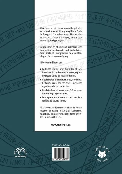 Ulvevinter er et dansk bordrollespil, der er skrevet specielt til yngre spillere. Spillet foregår i fantasiverdenen Tharos, der er beboet af tapre vikinger, vise troldmænd og farlige uhyrer. Dette er 3. udgave med opdaterede regler og eventyr. Så længe folk kan huske, har Vinterens og Sommerens dronninger kæmpet om herredømmet over landet. Vinterens Dronning har fundet sig en ny forkæmper og en tid med strid truer atter landet. Kan vores helte og eventyrere beskytte Tharos mod ulykkerne? Ulvevinter er et komplet rollespil, der indeholder næsten alt hvad du behøver for at spille. Du mangler kun rollespilsterninger, for at komme i gang. I Ulvevinter finder du: - Letlæste regler, som fortæller alt om hvordan du skaber en karakter, og om hvordan kamp og magi fungerer. - Beskrivelse af landet Tharos, med dets historie, riger, konger, byer - og de huler og ruiner du kan udforske - Beskrivelser af mere end 50 venner, fjender og sagnvæsener. - Fem spændende eventyr, der hver kan spilles på ca. tre timer. Du kan hente masser af gratis ekstramateriale på Ulvevinters hjemmeside; spillernes håndbog, karakterark, kort, spilplader og flere eventyr.