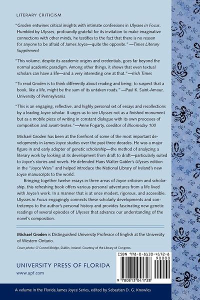 Michael Groden has been at the forefront of some of the most important developments in James Joyce studies over the past three decades. He was a major figure in and early adopter of genetic scholarship--the method of analysing a literary work by looking at its development from draft to draft, particularly suited to Joyce's stories and novels. He defended Hans Walter Gabler's Ulysses edition in the ""Joyce Wars"" and helped introduce the National Library of Ireland's new Joyce manuscripts to the world. Bringing together twelve essays in three areas of Joyce criticism and scholarship, this refreshing book offers various personal adventures from a life lived with Joyce’s work. In a manner that is at once modest, rigourous, and accessible, Ulysses in Focus engagingly connects these scholarly developments and contretemps to the author's personal history and provides fascinating new genetic readings of several episodes of Ulysses that advance our understanding of the novel’s composition.