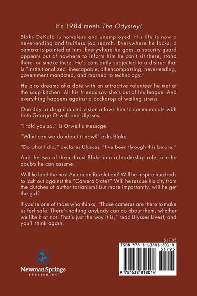 It's 1984 meets The Odyssey!Blake DeKalb is homeless and unemployed. His life is now a never-ending and fruitless job search. Everywhere he looks, a camera is pointed at him. Everywhere he goes, a security guard appears out of nowhere to inform him he can't sit there, stand there, or smoke there. He's constantly subjected to a distrust that is "institutionalized, inescapable, all-encompassing, never-ending, government mandated, and married to technology."He also dreams of a date with an attractive volunteer he met at the soup kitchen. All his friends say she's out of his league. And everything happens against a backdrop of wailing sirens.One day, a drug-induced vision allows him to communicate with both George Orwell and Ulysses."I told you so," is Orwell's message."What can we do about it now?" asks Blake."Do what I did," declares Ulysses. "I've been through this before."And the two of them thrust Blake into a leadership role, one he doubts he can assume.Will he lead the next American Revolution? Will he inspire hundreds to lash out against the "Camera State?" Will he rescue his city from the clutches of authoritarianism? But more importantly, will he get the girl?If you're one of those who thinks, "Those cameras are there to make us feel safe. There's nothing anybody can do about them, whether we like it or not. That's just the way it is," read Ulysses Lives!, and you'll think again.