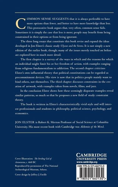 Common sense suggests that it is always preferable to have more options than fewer, and better to have more knowledge than less. This provocative book argues that, very often, common sense fails. Sometimes it is simply the case that less is more; people may benefit from being constrained in their options or from being ignorant. The three long essays that constitute this book revise and expand the ideas developed in Jon Elster's classic study Ulysses and the Sirens. It is not simply a new edition of the earlier book, though; many of the issues merely touched on before are explored here in much more detail. Elster shows how seemingly disparate examples which limit freedom of action reveal similar patterns, so much so that he proposes a new field of study: constraint theory. The book is written in Elster's characteristically vivid style and will interest professionals and students in philosophy, political science, psychology, and economics.