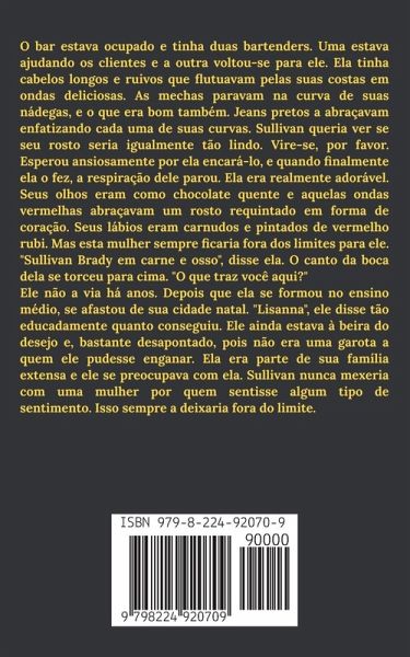 O bar estava ocupado e tinha duas bartenders. Uma estava ajudando os clientes e a outra voltou-se para ele. Ela tinha cabelos longos e ruivos que flutuavam pelas suas costas em ondas deliciosas. As mechas paravam na curva de suas nádegas, e o que era bom também. Jeans pretos a abraçavam enfatizando cada uma de suas curvas. Sullivan queria ver se seu rosto seria igualmente tão lindo. Vire-se, por favor. Esperou ansiosamente por ela encará-lo, e quando finalmente ela o fez, a respiração dele parou. Ela era realmente adorável. Seus olhos eram como chocolate quente e aquelas ondas vermelhas abraçavam um rosto requintado em forma de coração. Seus lábios eram carnudos e pintados de vermelho rubi. Mas esta mulher sempre ficaria fora dos limites para ele. "Sullivan Brady em carne e osso", disse ela. O canto da boca dela se torceu para cima. "O que traz você aqui?" Ele não a via há anos. Depois que ela se formou no ensino médio, se afastou de sua cidade natal. "Lisanna", ele disse tão educadamente quanto conseguiu. Ele ainda estava à beira do desejo e, bastante desapontado, pois não era uma garota a quem ele pudesse enganar. Ela era parte de sua família extensa e ele se preocupava com ela. Sullivan nunca mexeria com uma mulher por quem sentisse algum tipo de sentimento. Isso sempre a deixaria fora do limite.