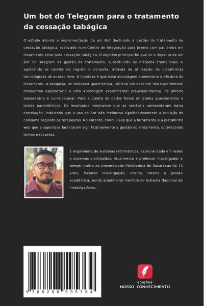 O estudo aborda a implementação de um Bot destinado à gestão do tratamento de cessação tabágica, realizado num Centro de Integração para Jovens com pacientes em tratamento ativo para cessação tabágica. O objetivo principal foi avaliar o impacto de um Bot no Telegram na gestão do tratamento, substituindo os métodos tradicionais e agilizando as tarefas de registo e consulta, através da utilização de plataformas tecnológicas de acesso livre. A hipótese é que essa abordagem aumentaria a eficácia do tratamento. A pesquisa, de natureza quantitativa, utilizou um desenho não-experimental transversal exploratório e uma abordagem experimental pré-experimental, de âmbito exploratório e correlacional. Para a coleta de dados foram utilizados questionários e testes paramétricos. Os resultados mostraram que as variáveis apresentaram baixa correlação, indicando que o uso do Bot não melhorou significativamente a redução do consumo segundo os terapeutas. No entanto, concluiu-se que a ferramenta e a plataforma web que a suportava facilitaram significativamente a gestão do tratamento, optimizando tempo e recursos.