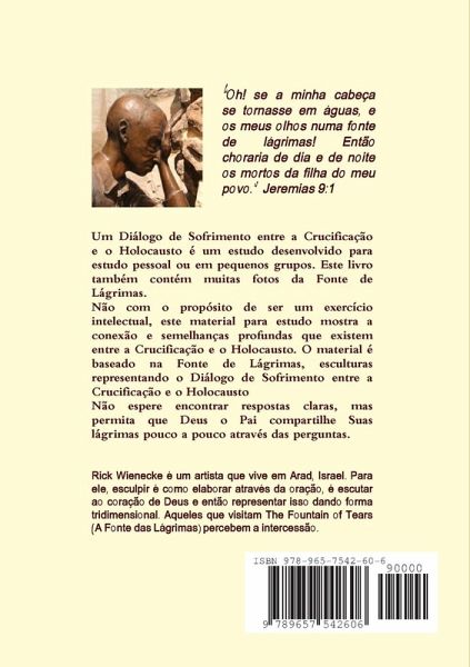 Português Um Diálogo de Sofrimento entre a Crucificação e o Holocausto é um estudo desenvolvido para estudo pessoal ou em pequenos grupos. Este livro também contém muitas fotos da Fonte de Lágrimas. Não com o propósito de ser um exercício intelectual, este material para estudo mostra a conexão e semelhanças profundas que existem entre a Crucificação e o Holocausto. O material é baseado na Fonte de Lágrimas, esculturas representando o Diálogo de Sofrimento entre a Crucificação e o Holocausto Não espere encontrar respostas claras, mas permita que Deus o Pai compartilhe Suas lágrimas pouco a pouco através das perguntas.