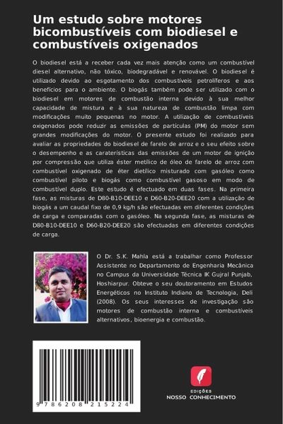 O biodiesel está a receber cada vez mais atenção como um combustível diesel alternativo, não tóxico, biodegradável e renovável. O biodiesel é utilizado devido ao esgotamento dos combustíveis petrolíferos e aos benefícios para o ambiente. O biogás também pode ser utilizado com o biodiesel em motores de combustão interna devido à sua melhor capacidade de mistura e à sua natureza de combustão limpa com modificações muito pequenas no motor. A utilização de combustíveis oxigenados pode reduzir as emissões de partículas (PM) do motor sem grandes modificações do motor. O presente estudo foi realizado para avaliar as propriedades do biodiesel de farelo de arroz e o seu efeito sobre o desempenho e as caraterísticas das emissões de um motor de ignição por compressão que utiliza éster metílico de óleo de farelo de arroz com combustível oxigenado de éter dietílico misturado com gasóleo como combustível piloto e biogás como combustível gasoso em modo de combustível duplo. Este estudo é efectuado em duas fases. Na primeira fase, as misturas de D80-B10-DEE10 e D60-B20-DEE20 com a utilização de biogás a um caudal fixo de 0,9 kg/h são efectuadas em diferentes condições de carga e comparadas com o gasóleo. Na segunda fase, as misturas de D80-B10-DEE10 e D60-B20-DEE20 são efectuadas em diferentes condições de carga.