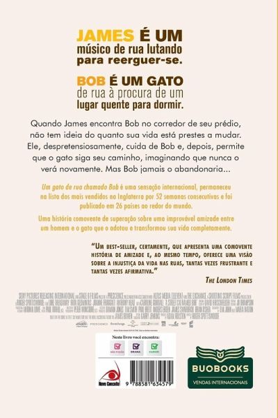 O livro que deu origem ao filme que emocionou milhares de pessoas em todo o mundo Sucesso no exterior, "Um gato de rua chamado Bob" ficou 52 semanas consecutivas na lista dos mais vendidos na Inglaterra e já teve seus direitos de publicação vendidos para mais de 26 países e na semana de lançamento no Brasil, já subiu para a lista dos livros mais vendidos. Em 2012, a história de James Bowen e do gato Bob foi destaque na mídia nacional como exemplo de superação e amizade entre os dois.Conheça um pouco da história de "Um Gato de rua chamado Bob": É uma tarde de outono em Covent Garden, Londres. Trabalhadores correm para o almoço, turistas brotam de todos os lados e clientes entram e saem das lojas. No meio de tudo isso está um gato. Usando um vistoso lenço Union Jack em volta do pescoço e cercado por uma multidão de 30 espectadores de boca aberta, Bob, o gatinho cor de laranja, sorri - é, sorri - timidamente. Próximo a ele, está seu dono James Bowen, com seu violão surrado, cantando músicas do Oasis. Então, ele para de tocar e se abaixa para Bob: "Vamos, Bob, cumprimente!", diz. Bob mexe os bigodes, levanta uma pata e a estende para James. A multidão assobia. Não é todo dia que se vê um gato sentado, calmamente, no centro de Londres, aparentemente sem se abalar com o barulho das sirenes, os carros passando e todo aquele movimento - mas Bob não é um gato comum...