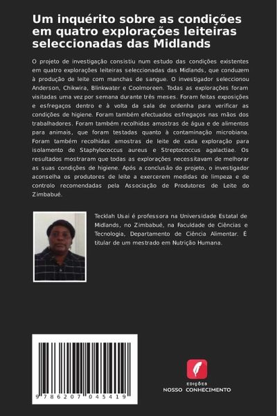 O projeto de investigação consistiu num estudo das condições existentes em quatro explorações leiteiras seleccionadas das Midlands, que conduzem à produção de leite com manchas de sangue. O investigador seleccionou Anderson, Chikwira, Blinkwater e Coolmoreen. Todas as explorações foram visitadas uma vez por semana durante três meses. Foram feitas exposições e esfregaços dentro e à volta da sala de ordenha para verificar as condições de higiene. Foram também efectuados esfregaços nas mãos dos trabalhadores. Foram também recolhidas amostras de água e de alimentos para animais, que foram testadas quanto à contaminação microbiana. Foram também recolhidas amostras de leite de cada exploração para isolamento de Staphylococcus aureus e Streptococcus agalactiae. Os resultados mostraram que todas as explorações necessitavam de melhorar as suas condições de higiene. Após a conclusão do projeto, o investigador aconselha os produtores de leite a exercerem medidas de limpeza e de controlo recomendadas pela Associação de Produtores de Leite do Zimbabué.