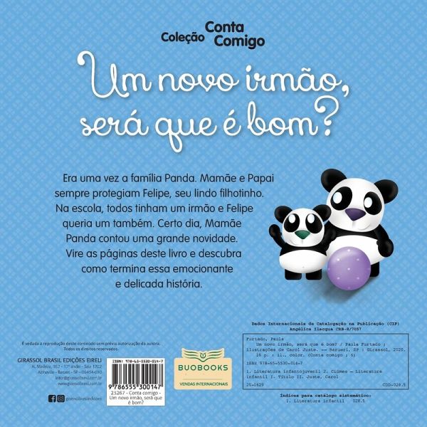 Era uma vez a família Panda. Mamãe e Papai sempre protegiam Felipe, seu lindo filhotinho. Na escola, todos tinham um irmão e Felipe queria um também. Certo dia, Mamãe Panda contou uma grande novidade. Vire as páginas deste livro e descubra como termina essa emocionante e delicada história.