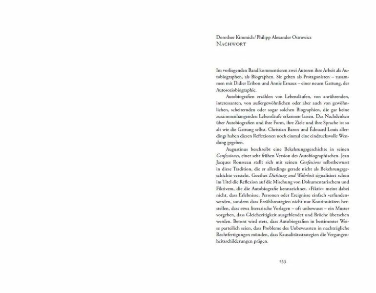 Christian Baron und Édouard Louis haben im Oktober und November 2023 die Vorlesungen der Tübinger Poetik-Dozentur gehalten. Im vorliegenden Band kommentieren beide ihre Arbeit als Autobiografen, als Biographen. Sie gelten als Protagonisten - zusammen mit Didier Eribon und Annie Ernaux - einer neuen Gattung, der Autosoziobiografie.Autobiographien erzählen von Lebensläufen, von anrührenden, interessanten, von außergewöhnlichen oder aber auch von gewöhnlichen, scheiternden oder sogar solchen Biographien, die gar keine zusammenhängenden Lebensläufe erkennen lassen. Das Nachdenken über…mehr