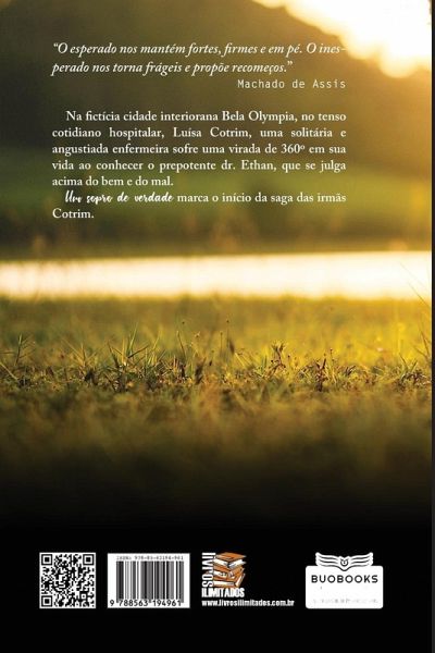 "Após os elogiados Folhas de Outono e Idas e vindas, Adriana Marcos retorna com Um sopro de verdade, um romance que marca o início da saga das irmãs Cotrim. Nesta obra, a autora carioca reafirrma seu estilo marcante de contar histórias; com emoção e sensibilidade, aborda temas importantes e atuais da psique feminina. Um livro repleto de reviravoltas e personagens cativantes que provocam nos leitores uma identificação instantânea, e deixam a impressão de que podem ser encontrados em qualquer lugar, a qualquer hora. A história se passa na fictícia Bela Olympia, cidade do interior do Rio de Janeiro. O cenário é o tenso universo hospitalar em que Luísa Cotrim, uma enfermeira competente e apaixonada pela profissão, vive as angústias de um amor perdido e sofre as sequelas deste passado. Entretanto, sua vida se transforma quando bate de frente com o prepotente doutor Ethan. Mas entre desentendimentos, traumas, preconceitos e verdades reveladas, seria o amor o ingrediente que falta à vida tumultuada destes personagens tão verdadeiros?"