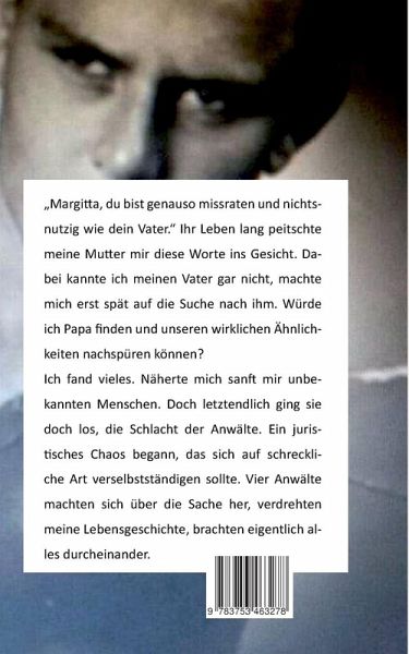 Margitta, du bist genauso missraten und nichtsnutzig wie dein Vater. Ihr Leben lang peitschte meine Mutter mir diese Worte ins Gesicht. Dabei kannte ich meinen Vater gar nicht, machte mich erst spät auf die Suche nach ihm. Würde ich Papa finden und unseren wirklichen Ähnlichkeiten nachspüren können? Ich fand vieles. Näherte mich sanft mir unbekannten Menschen. Doch letztendlich ging sie doch los, die Schlacht der Anwälte. Ein juristisches Chaos begann, das sich auf schreckliche Art verselbstständigen sollte. Vier Anwälte machten sich über die Sache her, verdrehten meine Lebensgeschichte, brachten eigentlich alles durcheinander.