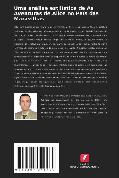 Este livro baseia-se na minha tese de mestrado. Trata-se de uma análise linguística multinível da obra Alice no País das Maravilhas, de Lewis Carroll, ao nível da fonologia, do léxico e da sintaxe. Também analisou o desvio das normas estabelecidas da pragmática e da lógica. Através desta análise linguística a vários níveis, o estudo revelou a manipulação criativa da linguagem por parte de Carroll, o que lhe permitiu captar o interesse de crianças e adultos de uma forma fascinante. A análise revelou que, a um nível superficial, o livro parece ser incongruente e sem sentido, porque os seus acontecimentos e argumentos não se enquadram no sistema aceite da nossa sociedade, o que cria humor. A um nível sério, no entanto, através dos argumentos disparatados, mas aparentemente lógicos, Carroll conseguiu mostrar como os adultos e o seu mundo são confusos para as crianças. Conseguiu também transmitir mensagens mais profundas, como satirizar a educação e os sistemas judiciais da sociedade vitoriana e ridicularizar alguns aspectos da sociedade vitoriana restritiva. Foi através da manipulação criativa da linguagem que Carroll conseguiu entrelaçar o absurdo e a lógica para criar sentido a partir do absurdo e transmitir todos estes efeitos.